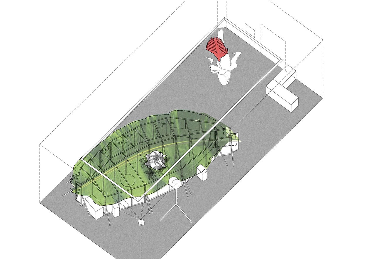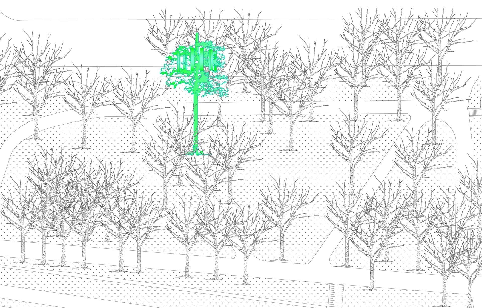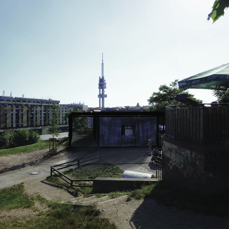 Hill Parukarka, park with the traditional low-cost garden pub is a place where very various types of groups and people meet. Frame with inserted light laminated box, intentionally susceptible to damage and aging, reacts to existing community atmosphere of openness as well as provides the possibility of change in volume as well as in time. The project reacts to planned reconstruction of the pub. |
