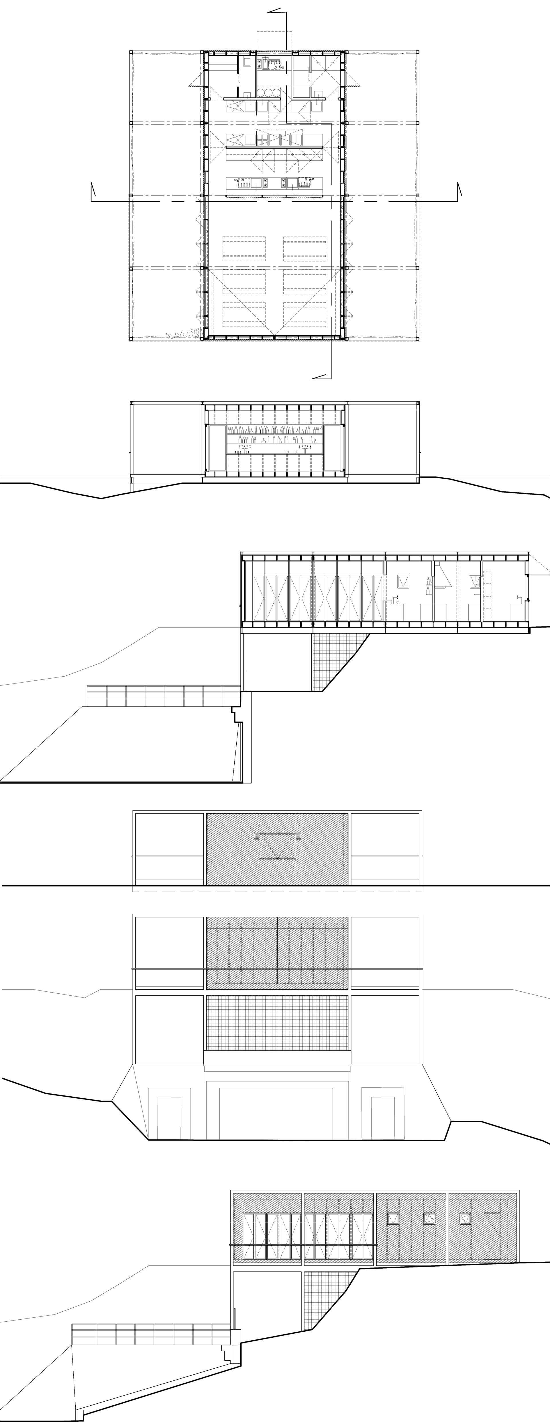 An initiative house for a bordering lot of the proposed linear structures of former rails of Smichov. Poor light conditions, topographic break and a metaphoric borderline of the old and the future city formed a roof-less house of changing function. |