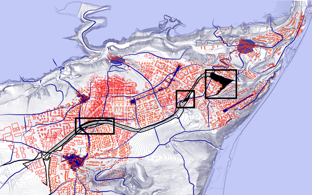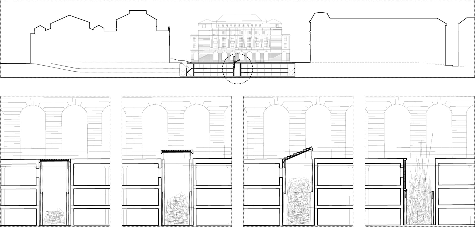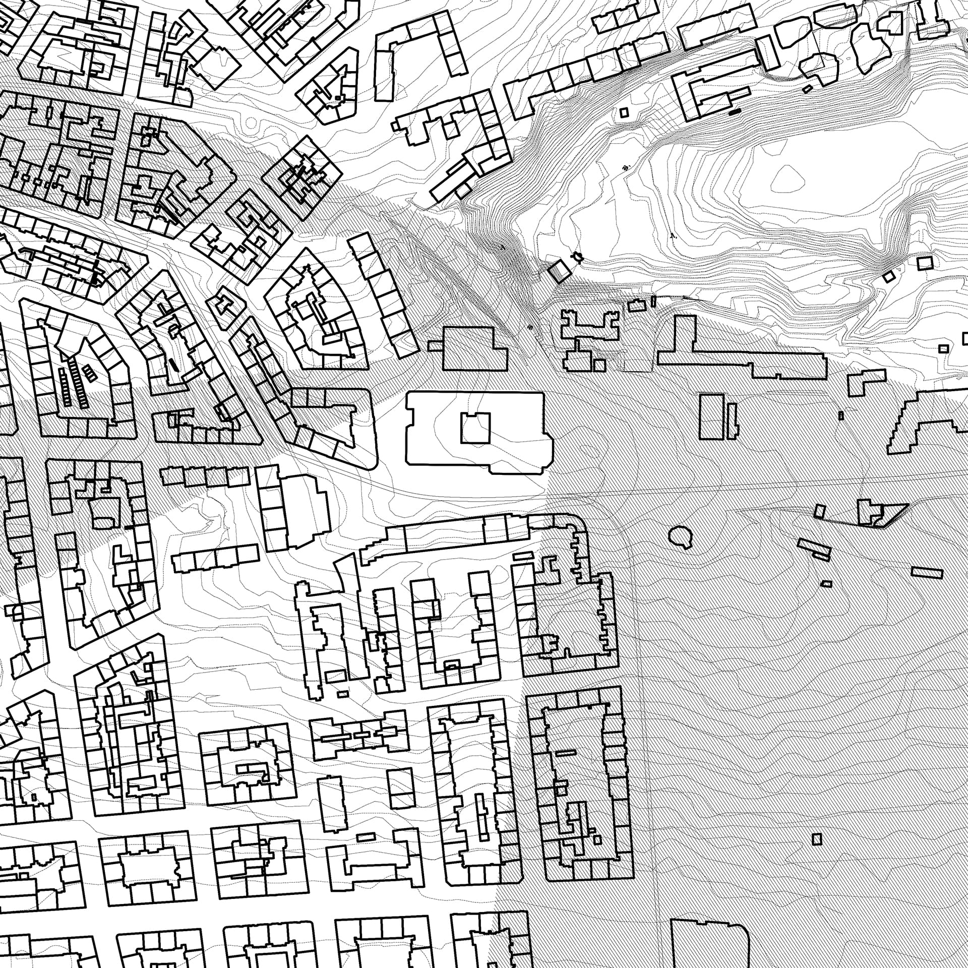 Two example projects, a multipurpose public workshop (1) and a swimming pool with a shooting range(2), deal with problematic of supplementing functions missing to the well-protected landscape of the historical city center. Functions that are spacially demanding are inserted altogether with the needed renovation of public spaces. underground influences the character of its cover and the other way around. |