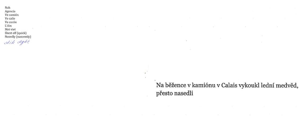 Information and context-free texts created by American by noting recited clippings from Czech media. Articulation of both-sided cultural disconnection. In collaboration with Julia Stoddard. |