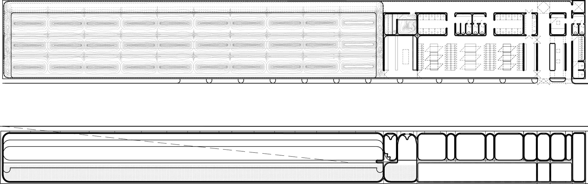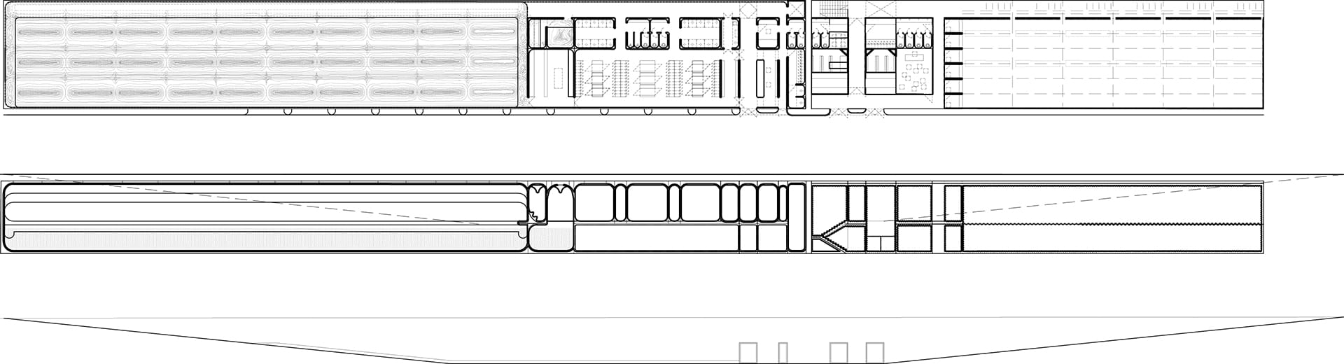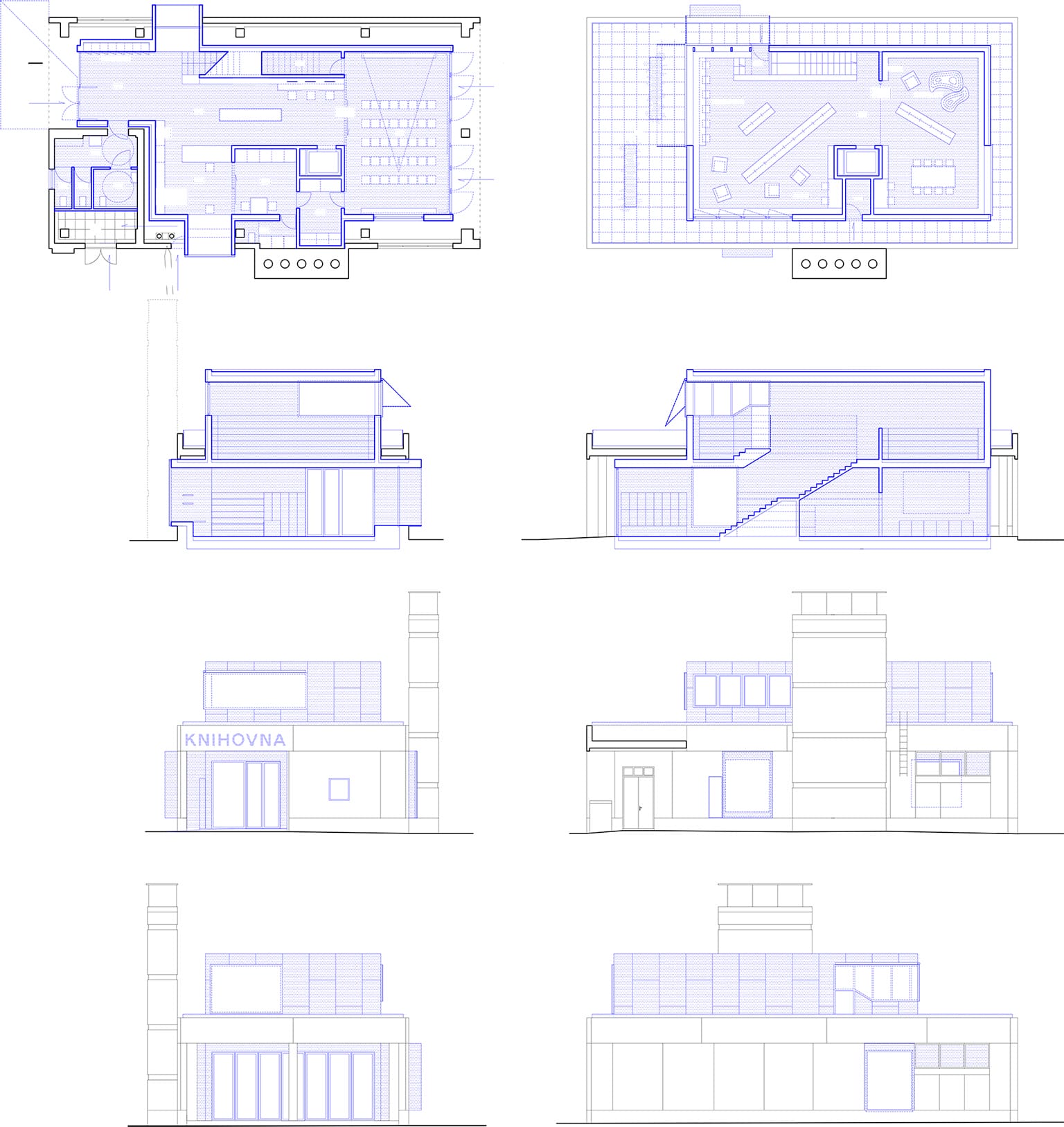 Competition proposal of library in Nové Sady, Olomouc. In collaboration with Petr Bureš and Alžběta Kvasničková. Igor Machata text, grafika architektury Eliška Fenclová. |