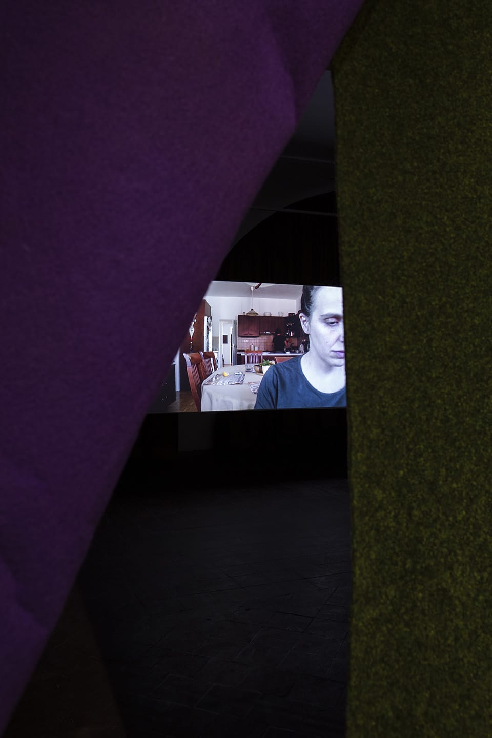 Lea Petříková's show in the ect gallery presents two pieces examining the medium of film, its elusiveness of capturing the fictional and the limits of mediated perception. Exhibition architecture draws on the movie set double sidedness. For the two videos in the exhibition, two diverse environments are being created: a dark stage set, inviting the viewer to the fragments of the mythical mountain of illusion, and its other side, the back of the scene, exposing "the forest" - the background of the fictional - to the street. Photos by Jan Kolsky.com. For more see >> leapetrikova.com >> etcgalerie.cz |