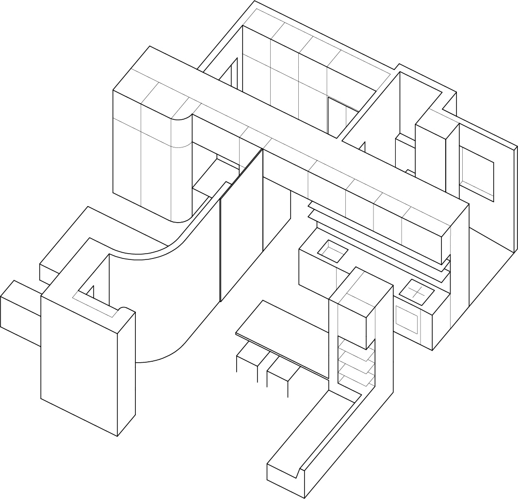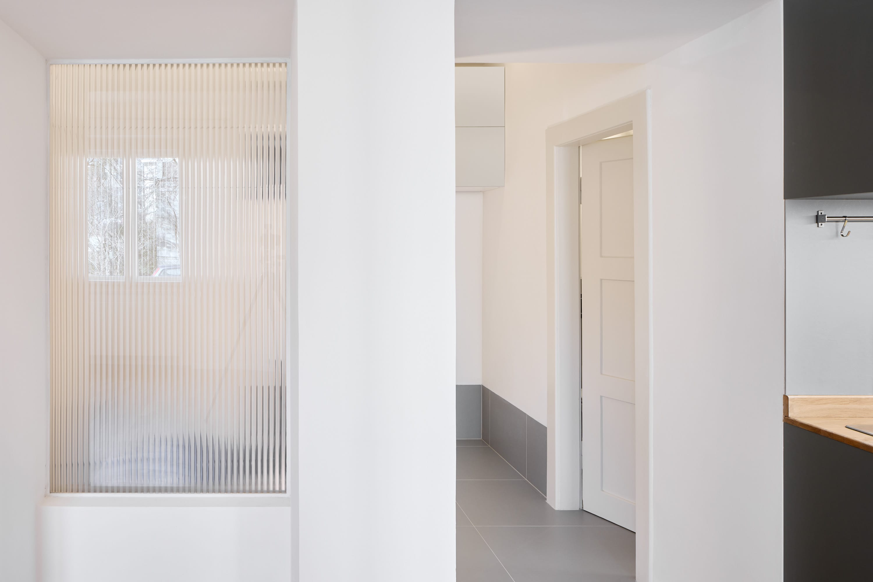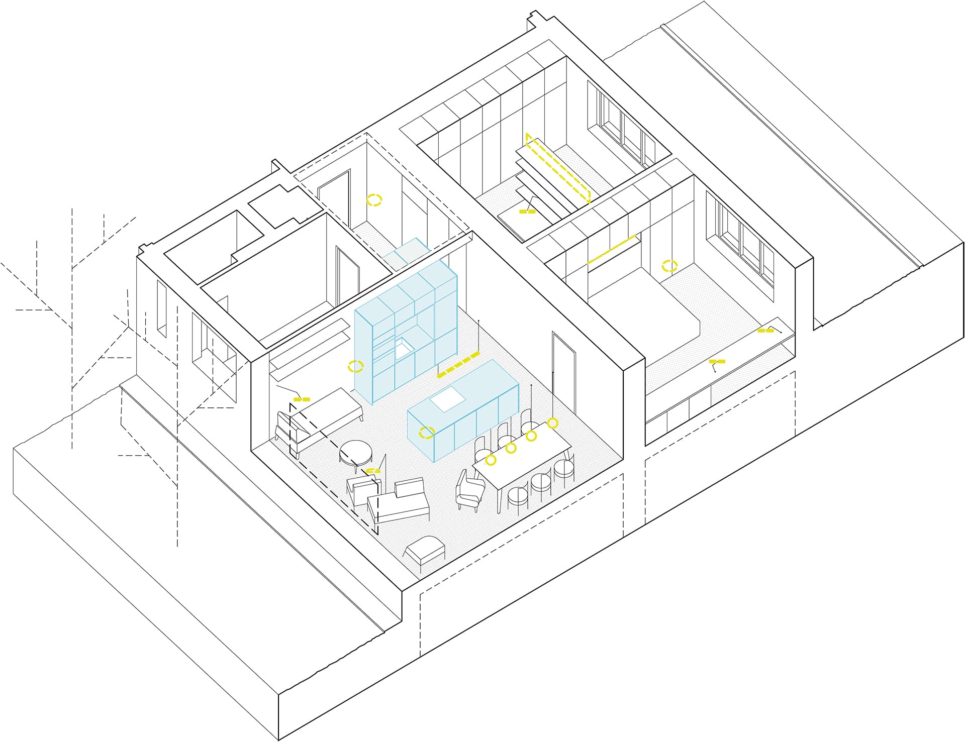 An apartment for a young family on the lower ground floor of a linear development from the '50s. Emphasis on natural lighting and sufficient storage space, clear functional zoning, and differentiation of areas for movement, work, relaxation, and sleep is inscribed mainly in the continuous space of the entrance hall, kitchen with dining and living room. The furniture block partially divides the hall and common family spaces minimizes corridor space while bringing enough light to the entrance hall. The concealed sliding door allows quiet reading by the window to the shared garden as well as evening movie screenings. The design of the rooms with large built-in wardrobes offers free space for the concentrated work, play, and sleep for all four members of the family. |