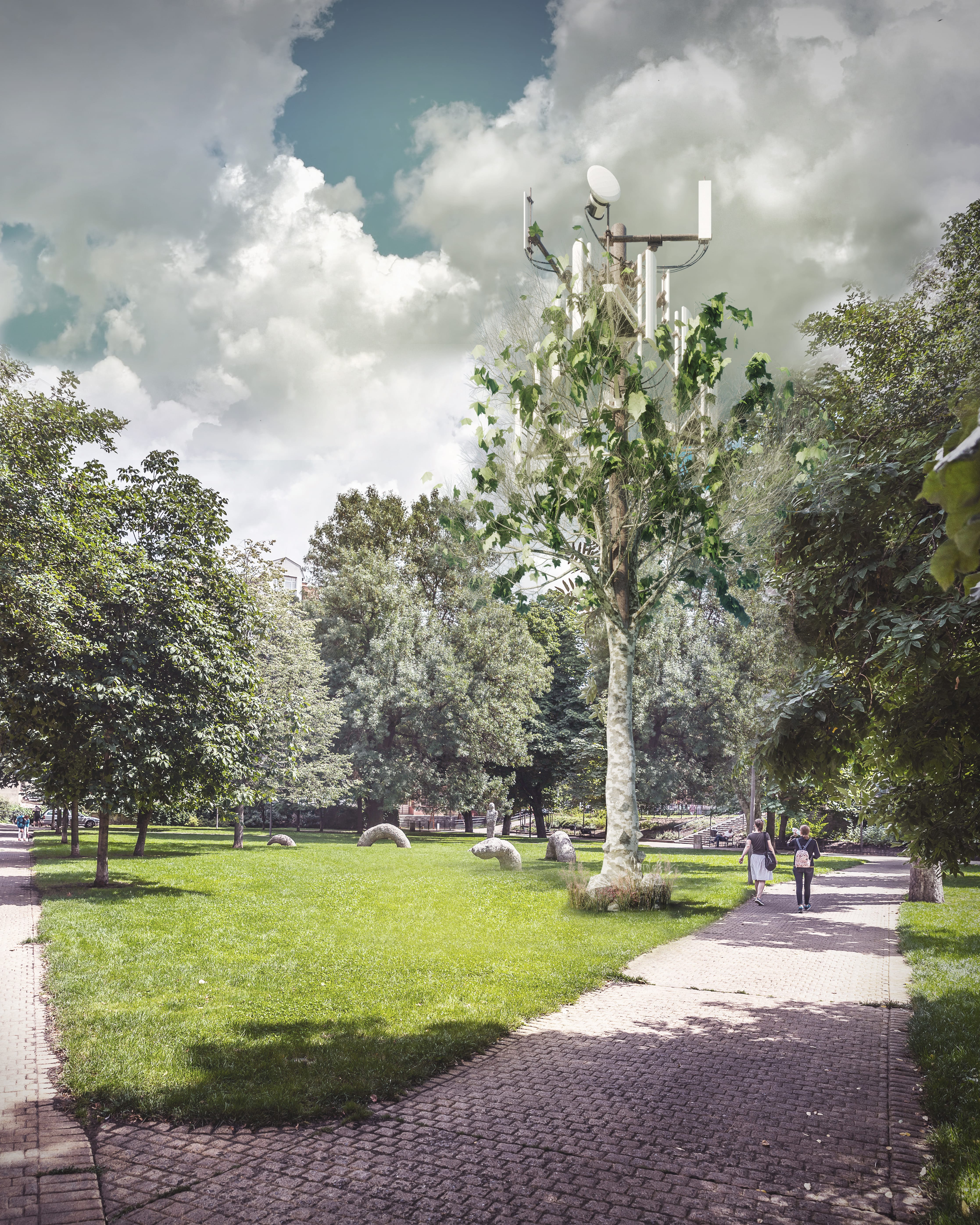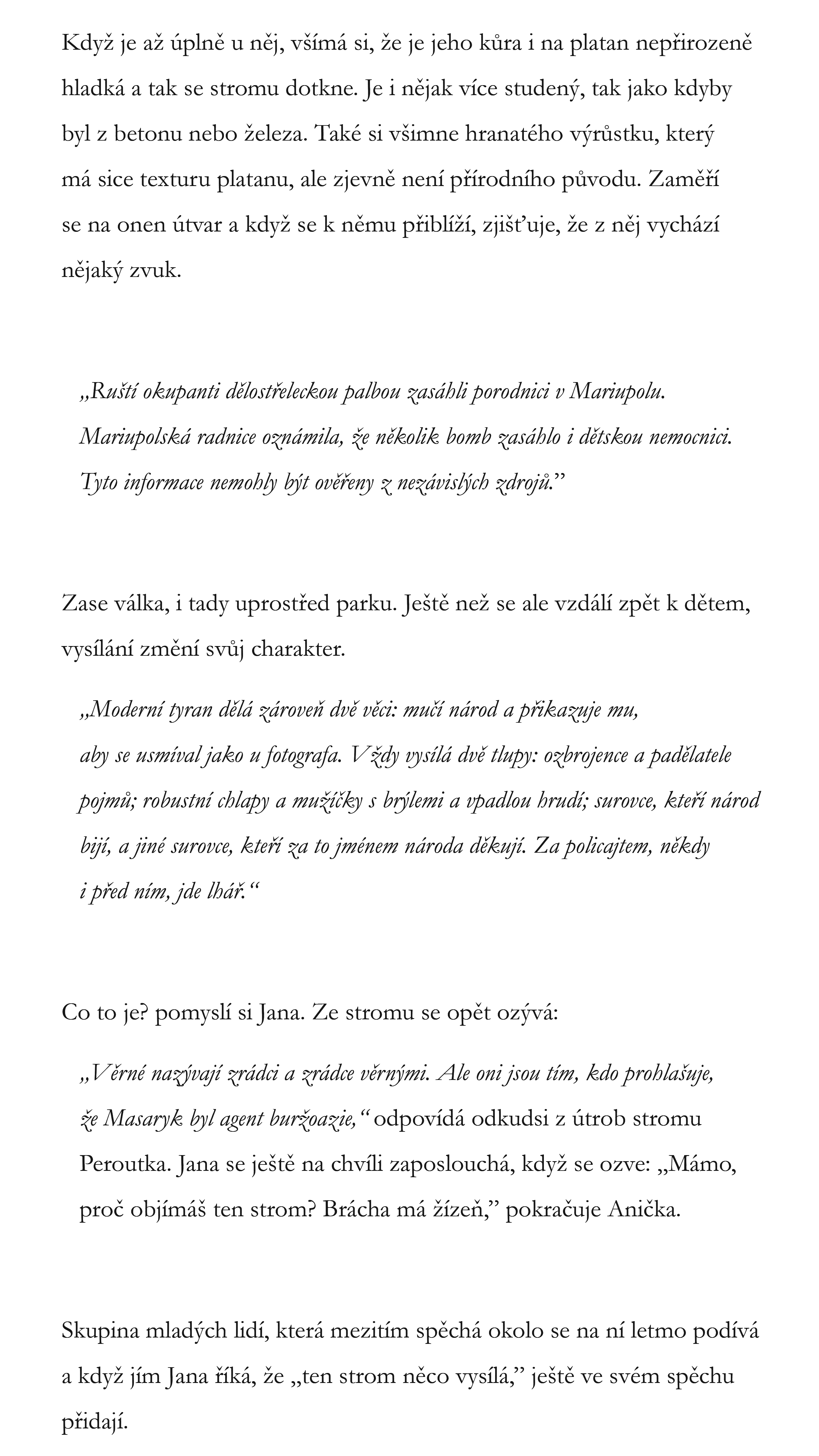 Ferdinand Peroutka as a constant. Unchanging through budding spring and blooming summer. But also exactly like that, in the decline of autumn and the gloom of winter. At first glance, the artificial tree sculpture doesn't stand out much in the park. It is only when we look closer and listen carefully that we notice it: at a sufficient distance from the strange tree, we hear quiet voices - archival recordings from Peroutka's time and period broadcasts of the Radio Free Europe alternate with current radio news from Czech Radio Plus, which follows on from RFE. It thus transfers Peroutka's conviction about the free availability of objective information to the present, to the public space, and thus to everyone equally. In collaboration with Vojtech Radakulan |